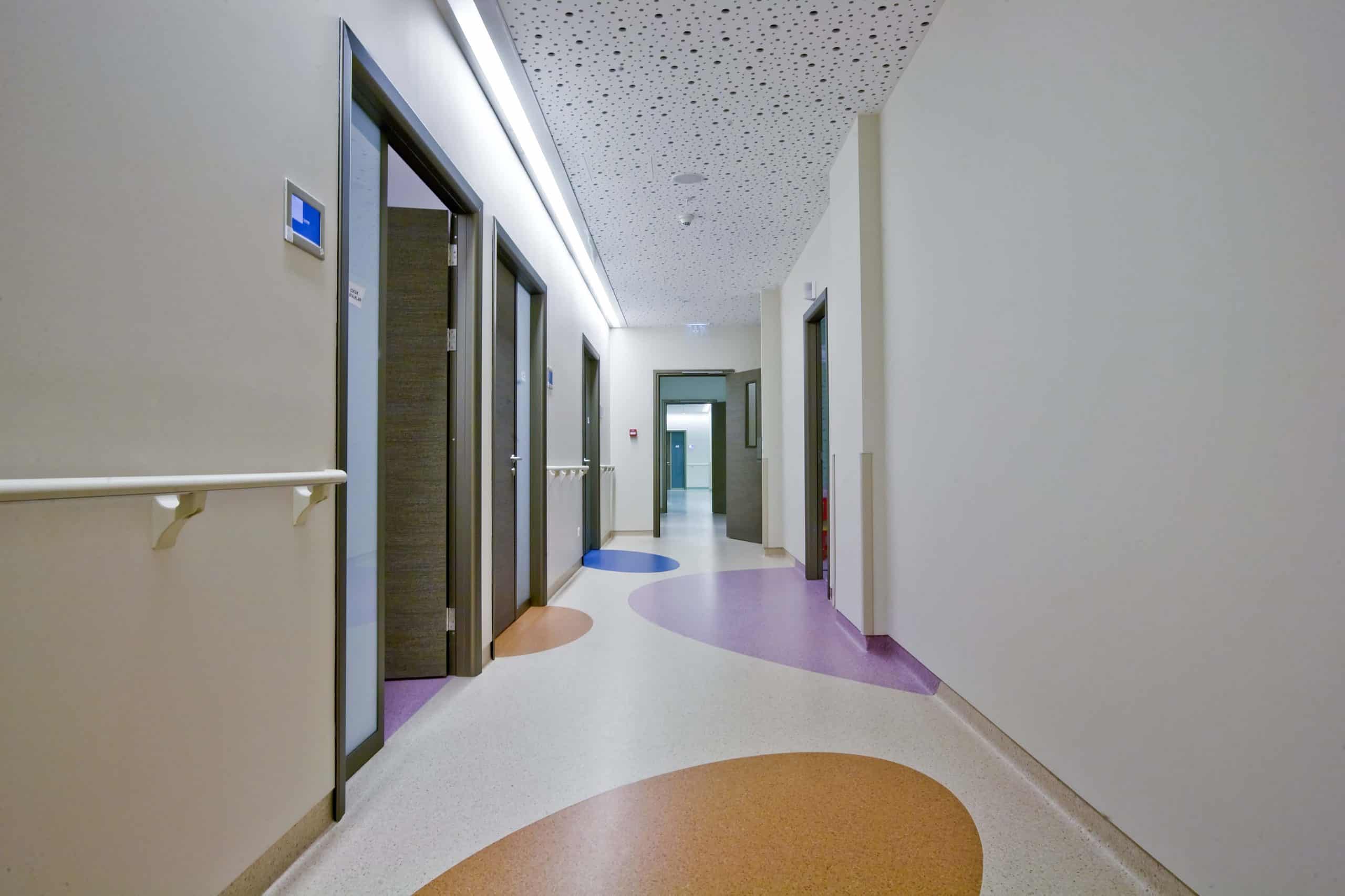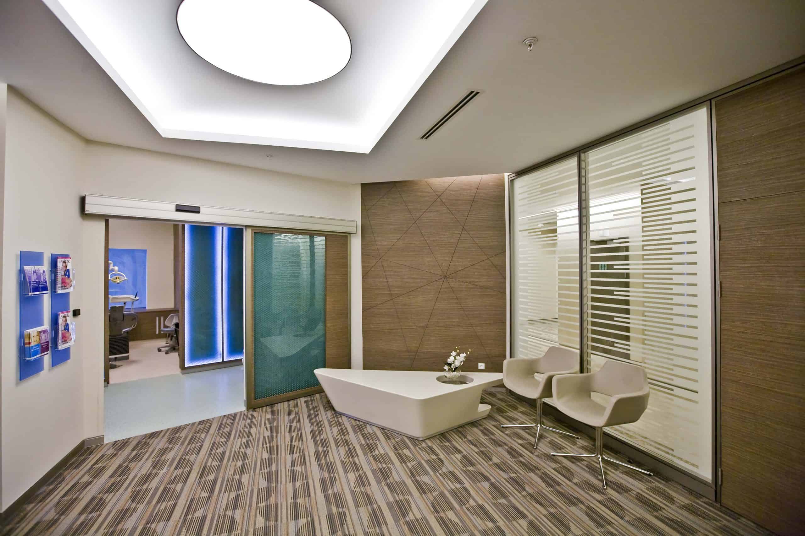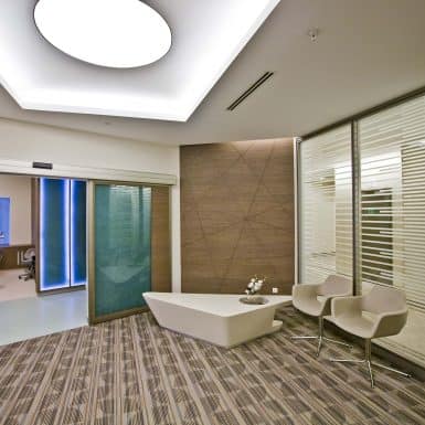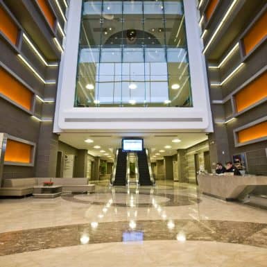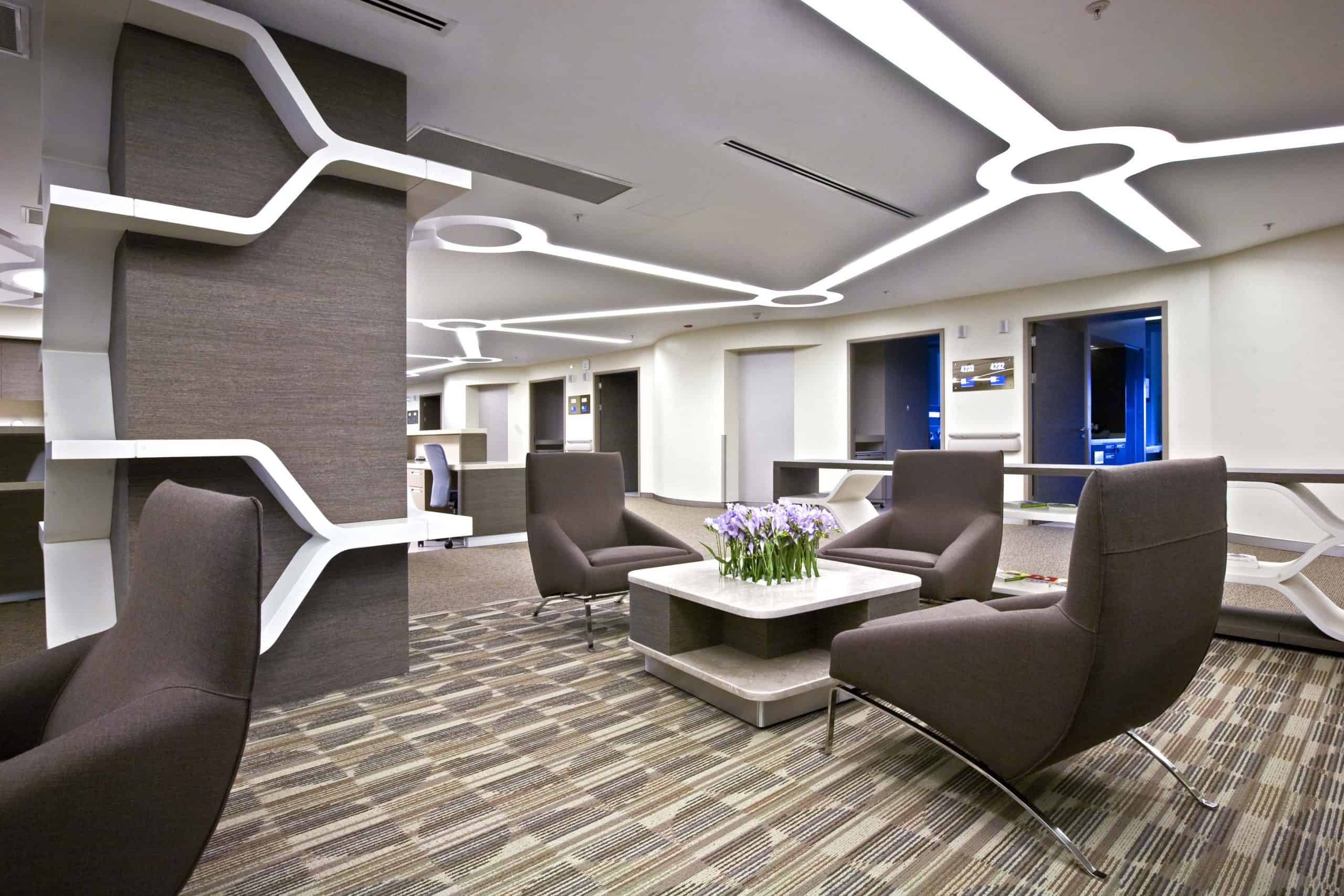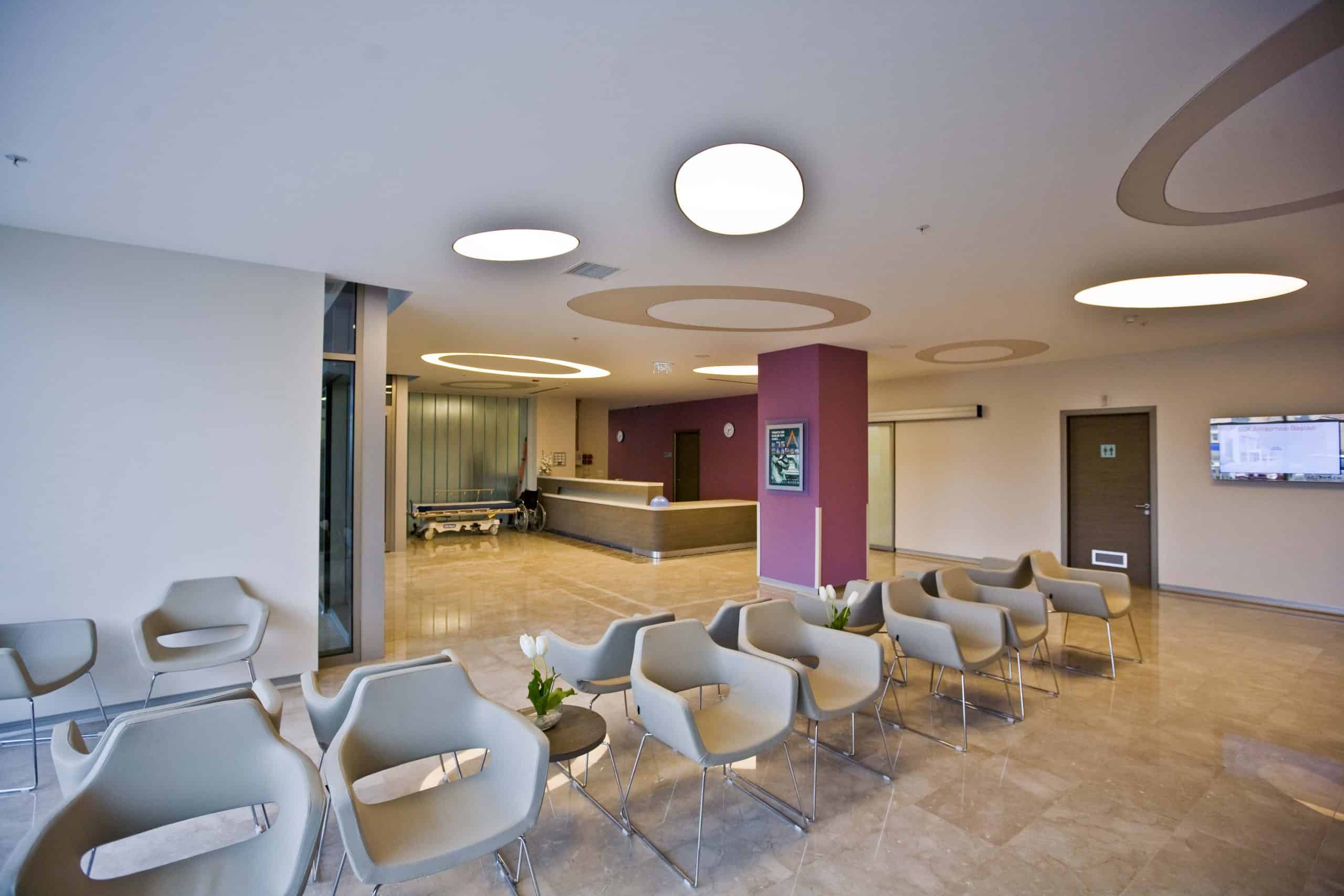 The main distinction of Acıbadem Maslak Hospital is its versatile association with the area of future’s trade center on the direction of city expansion where several cultural and social facilities are located. Besides its proximity to the city center and easy transportation facilities including the subway directly connecting to the hospital, another major charateristic is its unique position almost inside the city forests. The microscopic view of epithelium tissue, which is a crystallized net, is used as the base for the conceptual interior design in patient floors and taken as the distinctive mark of the design. The shape of the epithelium tissue is stylized by merging the form into one plane and applied to ceilings as concealed lighting. The patients are taken to their rooms through this specifically illuminated environment. In the patient rooms, a continious arc shaped unit has been designed which covers all technical equipments and special lighting components. The form of the unit is designed for giving the feeling to patient that he/she is at the focal point of all attention and services. The comfort of the patients are increased with various acoustic solutions such as carpet floorings, acoustic ceilings and second glass shell on the façade to prevent the traffic noise while silent common areas are designed for visitors.